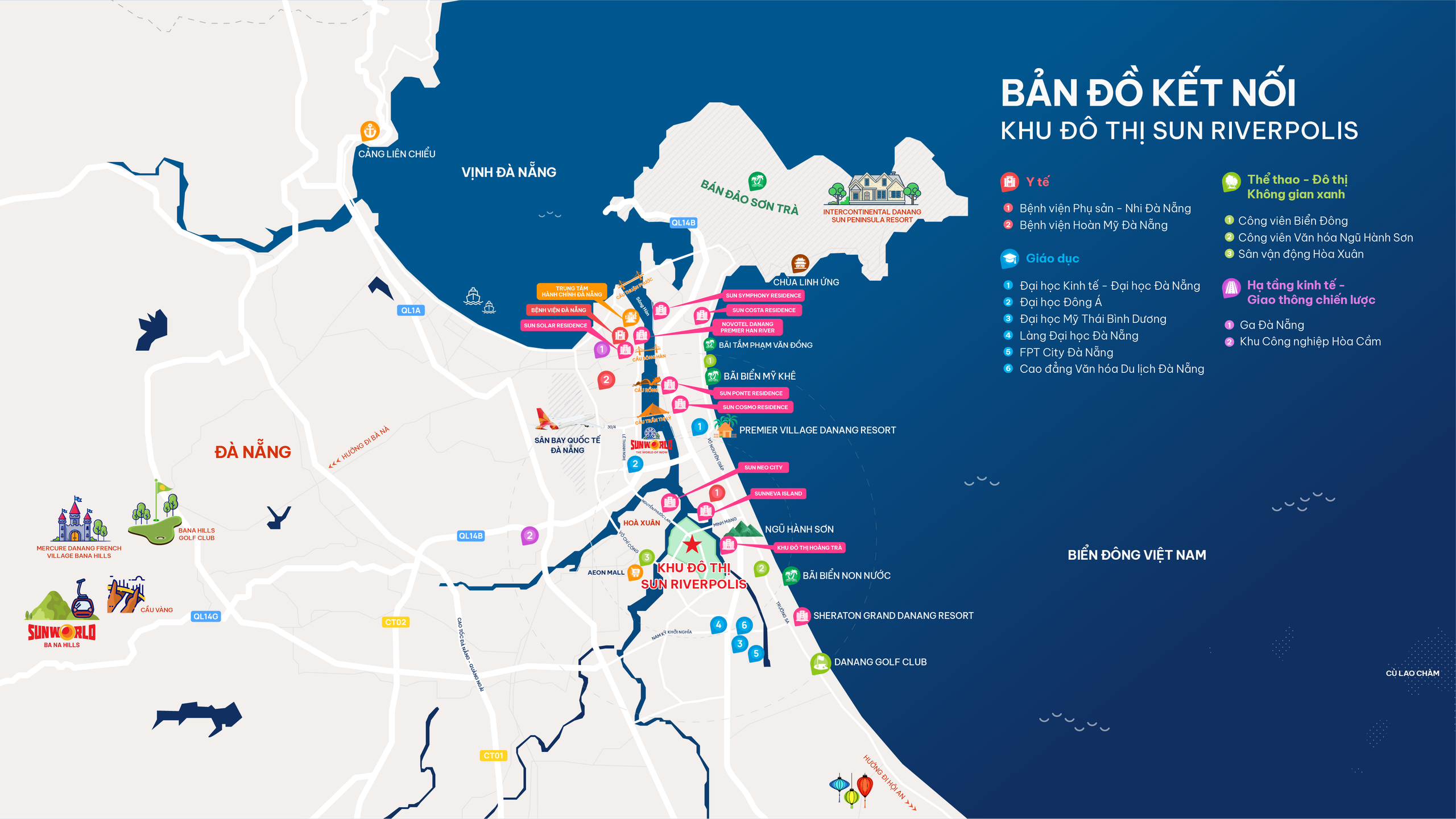 Tại đây, Sun Group đã sớm định hình một quần thể quy hoạch thông minh – đồng bộ – hiện đại, sở hữu địa thế hiếm có khi được bao bọc bởi các dòng sông, tạo nên môi trường sống trong lành và giàu giá trị sinh thái.